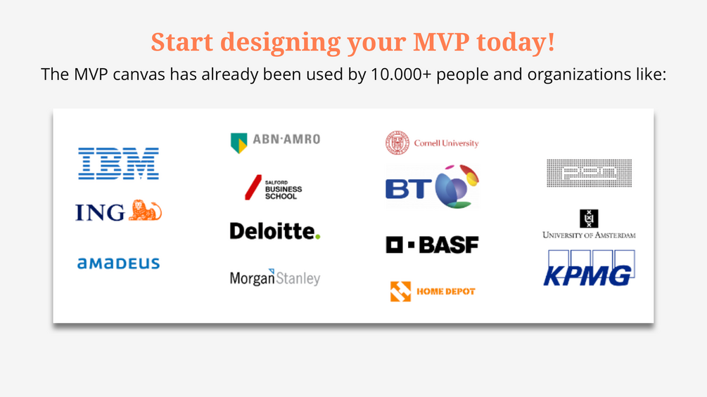 The MVP Experiment Canvas has already been used by 10.000+ people and organizations like IBM, ING, Deloitte, Morgan Stanley & Cornell.